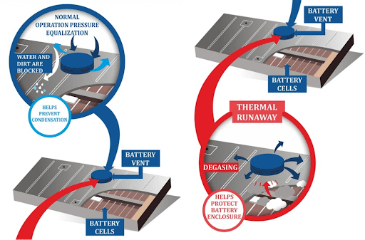 During extreme conditions, battery cells can release gases due to electrolyte decomposition. To prevent pressure buildup and potential explosions, venting mechanisms are integrated into battery designs: