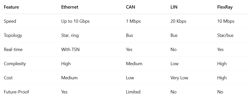 Comparison: Automotive Ethernet vs CAN, LIN, FlexRay