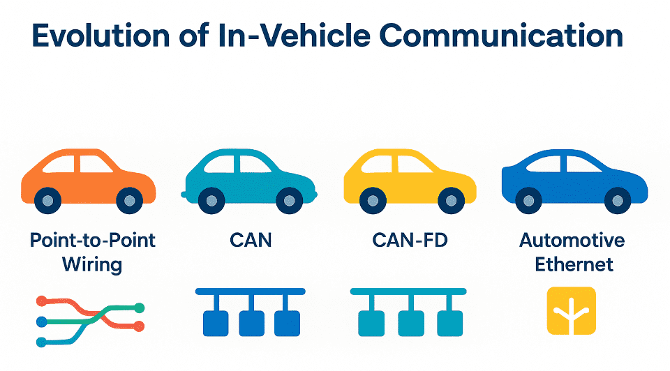 Early vehicles used point-to-point wiring to connect electronic components. As complexity grew, this approach became impractical. The solution came in the form of networked architectures using protocols like CAN, LIN, FlexRay, MOST, and now, Automotive Ethernet.