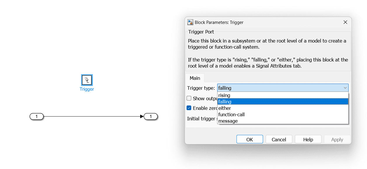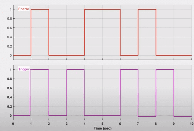 Trigger Port: The control signal that determines when the subsystem should operate enters through this port. The subsystem only operates when the signal is rising, which means it starts working when the signal swings from a low to a high value.