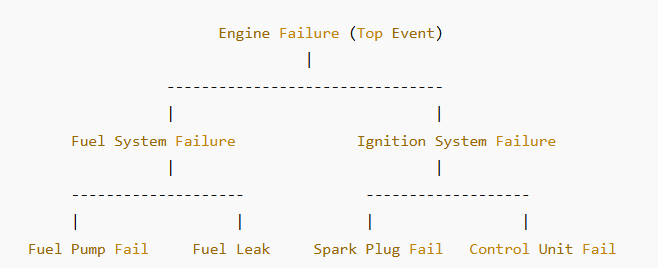 • The top event (engine failure) could be caused by fuel system failure or ignition system failure.