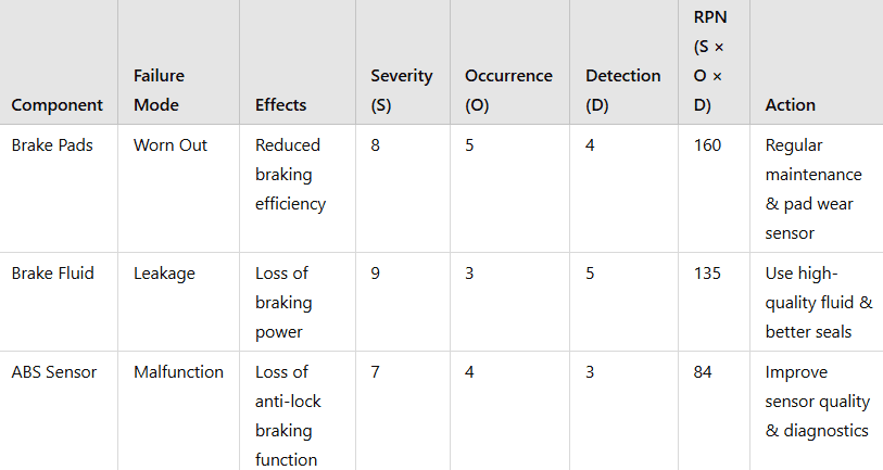 A car’s braking system is crucial for safety, Engineers use FMEA to analyze potential failures and their effects.