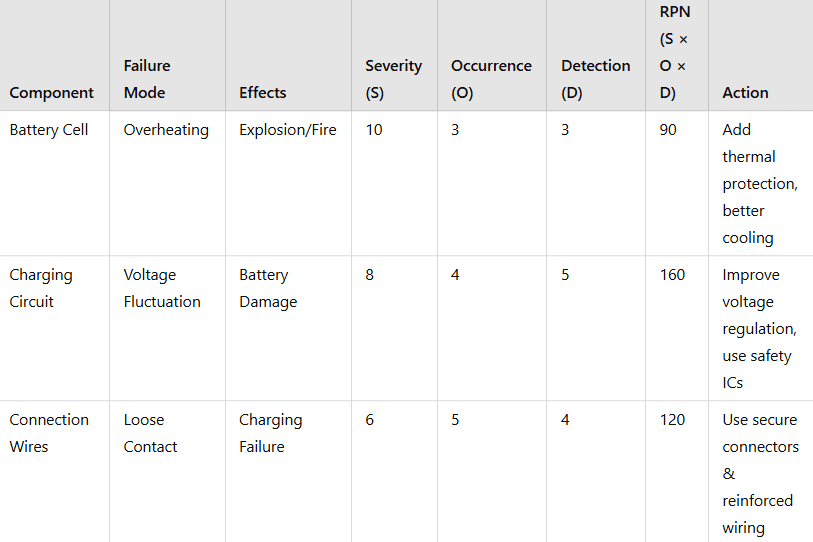 • Charging circuit failure has the highest RPN (160), meaning it poses the greatest risk.