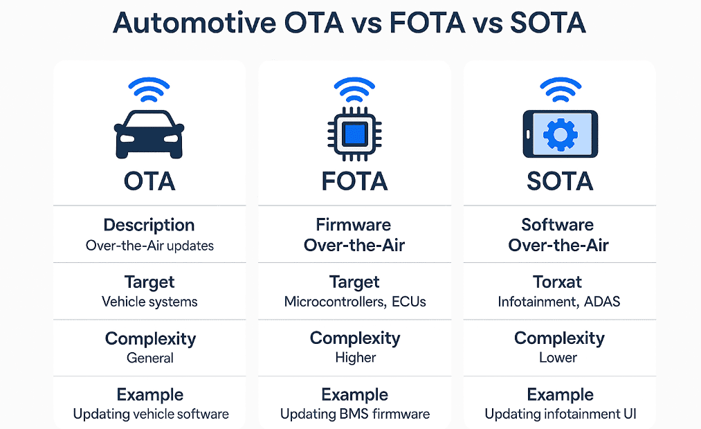 Within this OTA ecosystem, two essential subcategories exist: FOTA (Firmware Over-the-Air) and SOTA (Software Over-the-Air). While they are often used interchangeably, they serve distinct purposes and target different layers of the vehicle’s architecture.