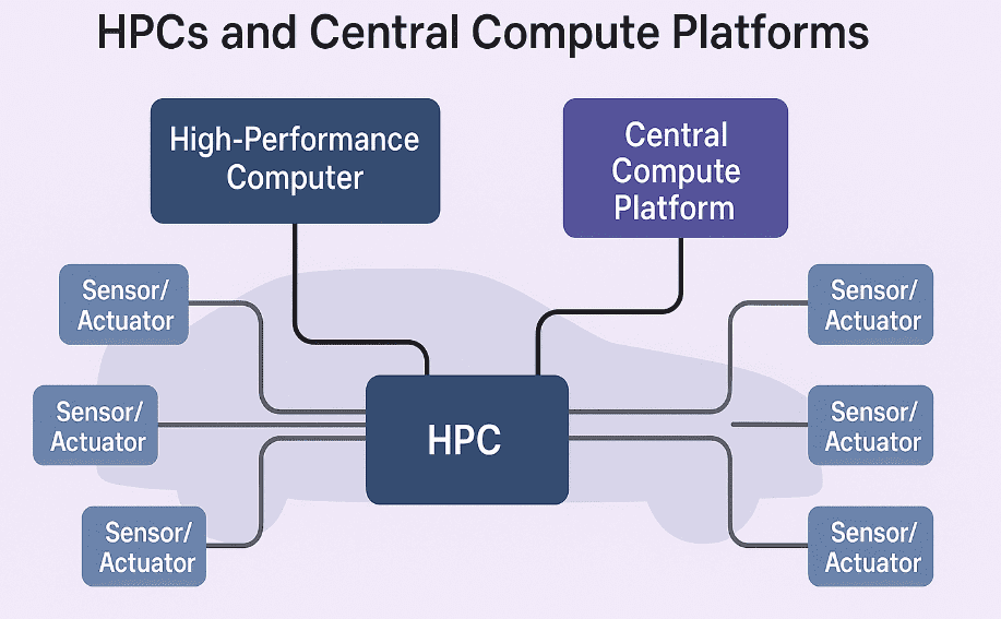 HPCs in SDVs replace multiple independent ECUs by centralizing computing power for entire vehicle domains or even the entire vehicle. These powerful units often integrate CPUs, GPUs, TPUs, and even AI accelerators.