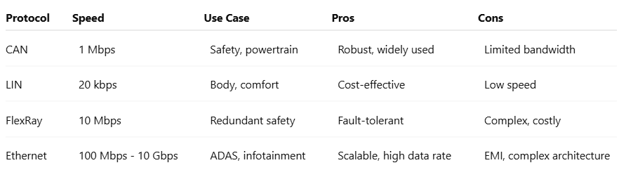 Efficient in-vehicle communication is the backbone of SDV functionality. Let’s break down the most common protocols:
