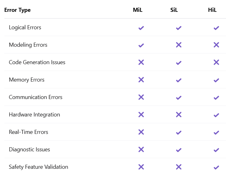 Comparison Table: Errors in MiL, SiL, and HiL