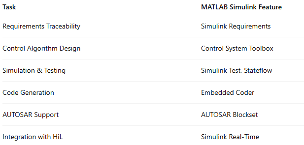 • ? Continuous Validation: Models can be tested at every stage (MIL, SIL, PIL, HIL).